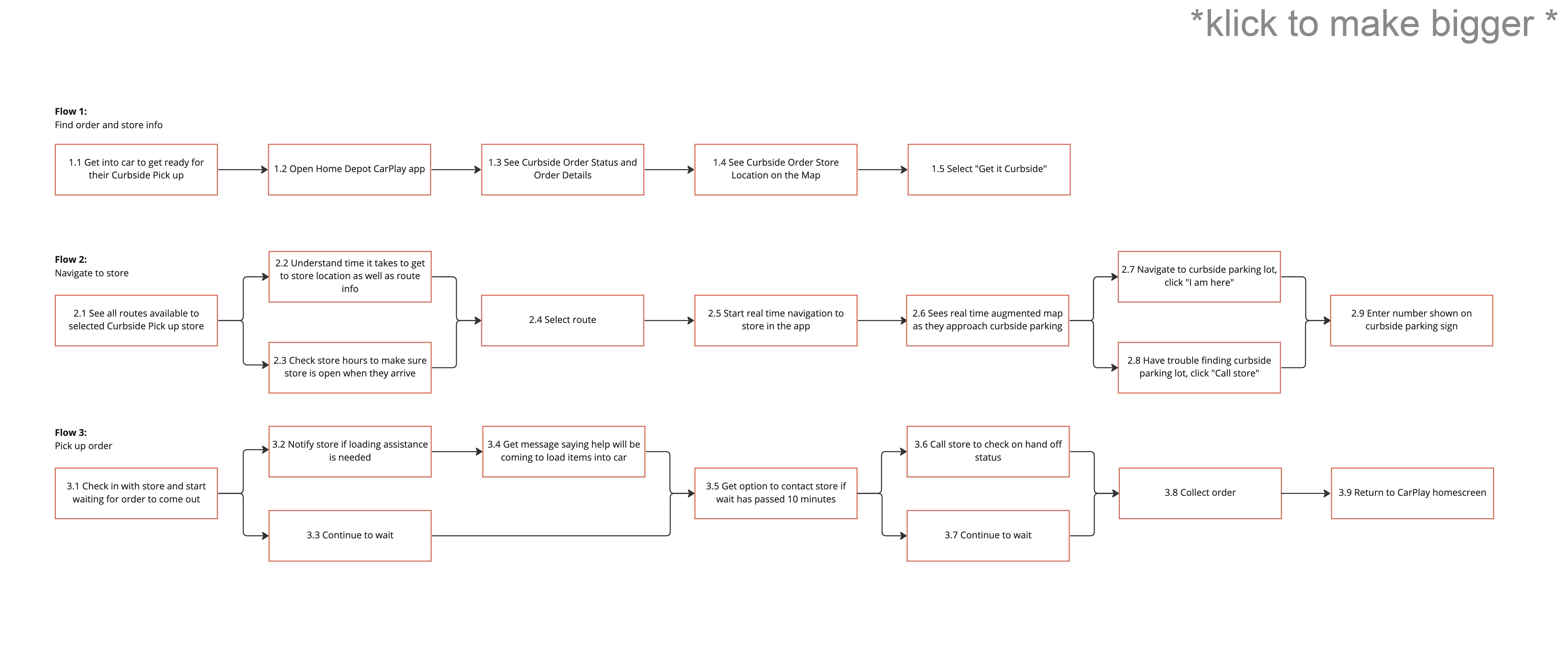 We envisioned three tasks we wanted the user to follow. These include main functional elements, such as order information, store selection, navigation to store, parking lot navigation, check-in, and assistance.