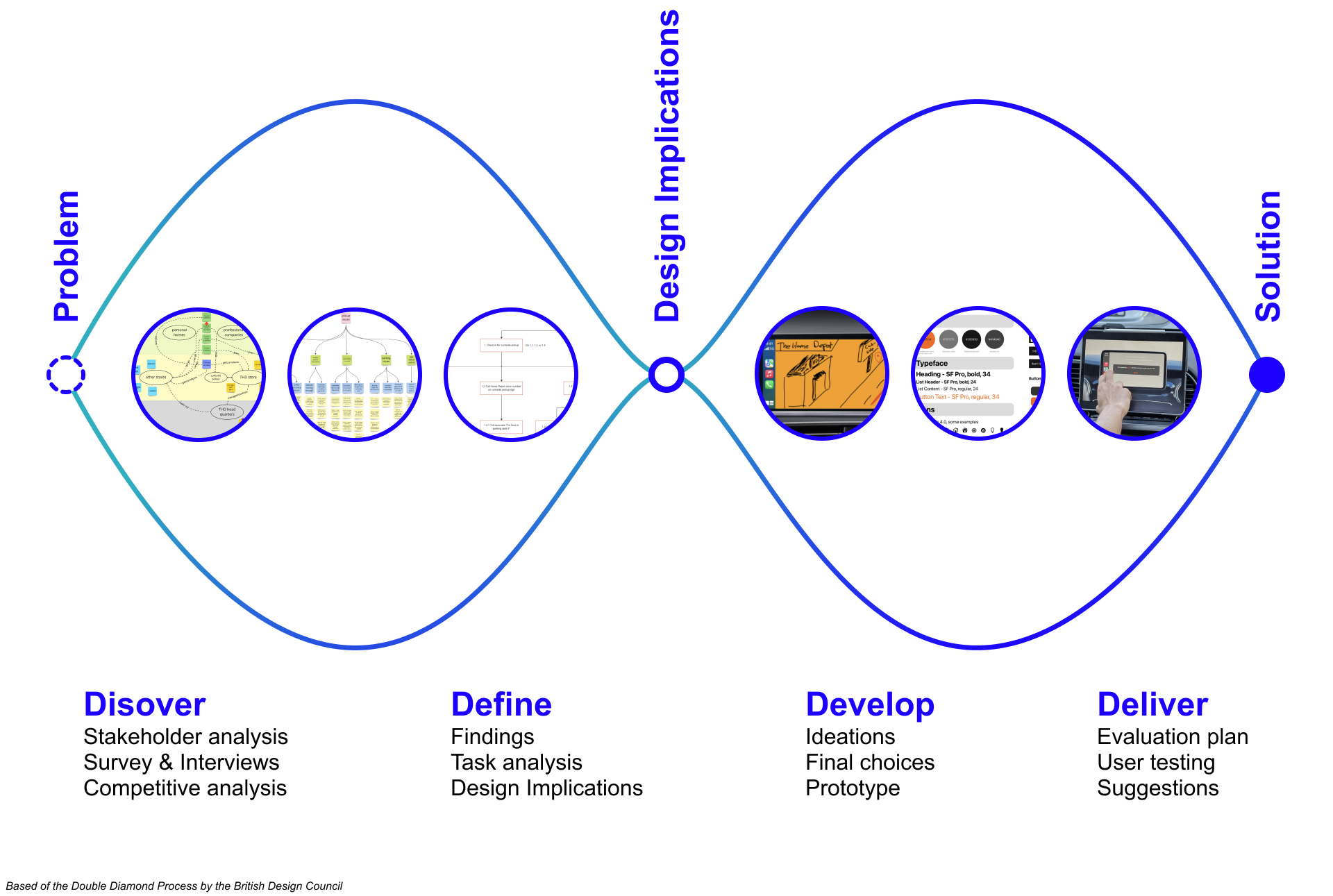 Our project can be divided into four main areas based on the double-diamond design process. The following graphic gives an overview of the steps and tasks involved in each one.