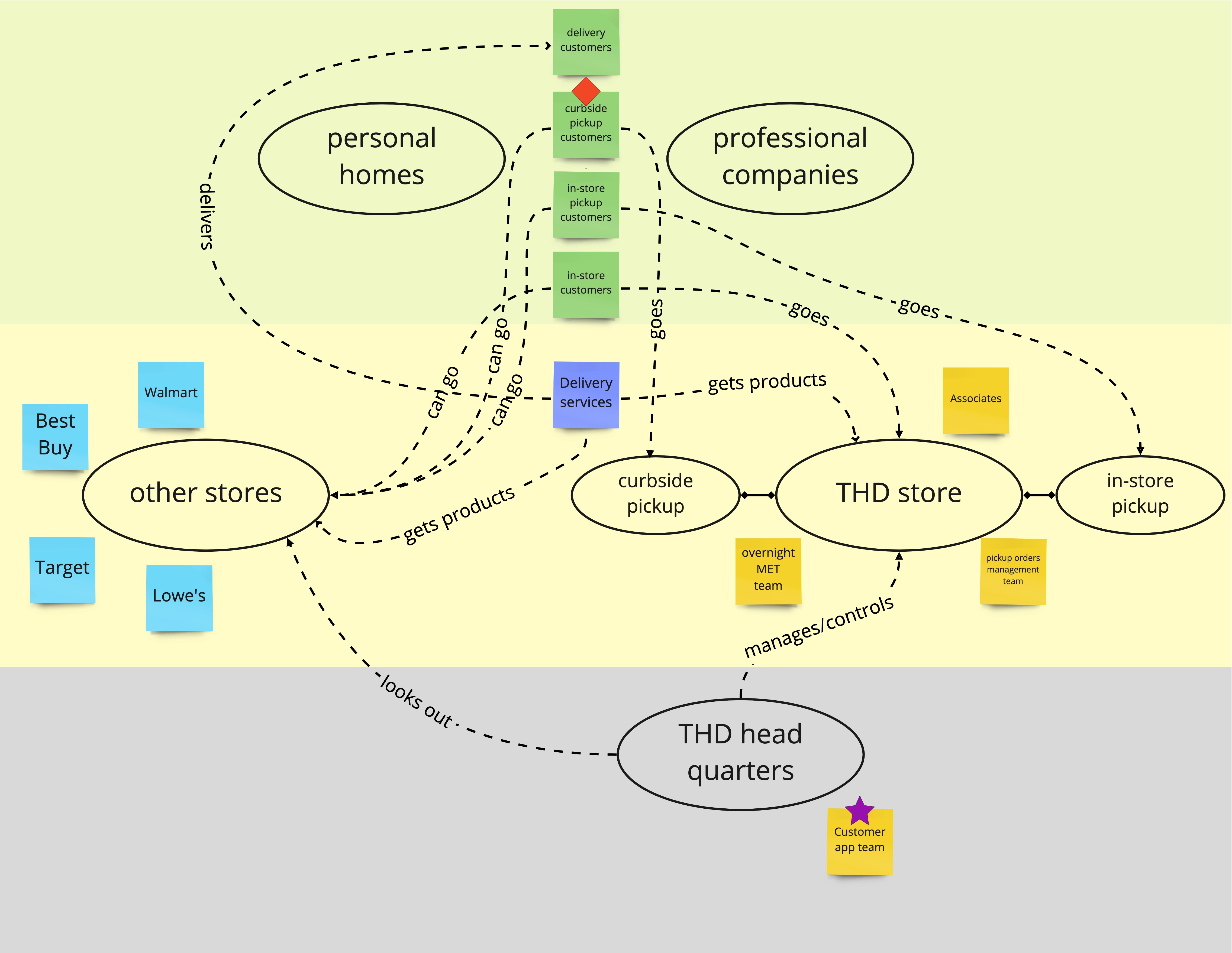 Including all possible stakeholders in our design process is essential to create the best suitable design for not just one part. Consequently, we illustrated our stakeholders, their locations, and their relations with each other in a stakeholder map that can be seen further down below. The main stakeholders were the delivery customers, the Home Depot associates, and the customer app team.