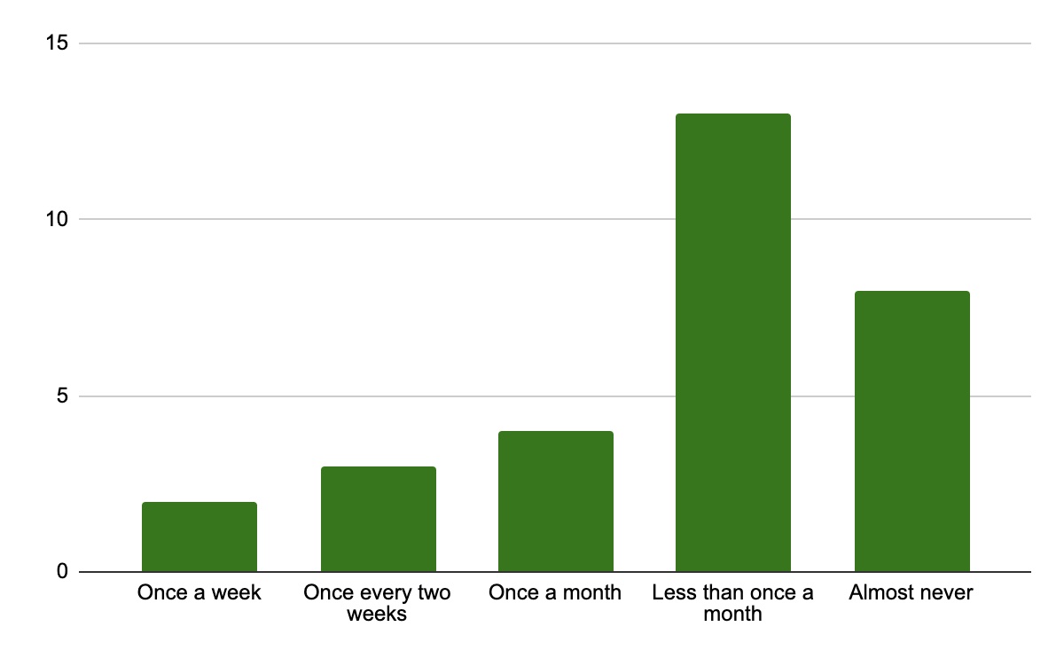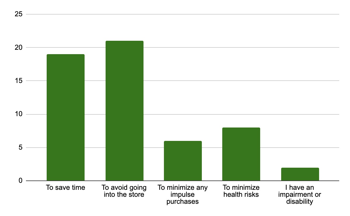 Other findings were direct outputs from the survey data like “How often people use curbside pickup in general” or “Reasons for using curbside pickup in general,” as seen in the graphs below.