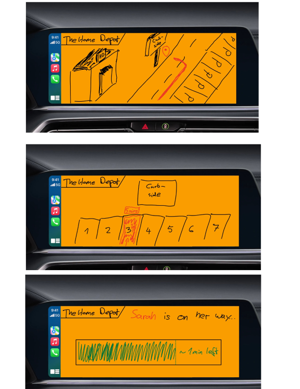 Our prototype was built in Figma to navigate the user to the Home Depot store where the curbside order is waiting (the prototype can be accessed at the top of this page). Then they are shown a way to the curbside spot and check in for the associates to bring the order out. We chose the CarPlay idea instead of the re-designed parking spot and license plate reader. The main reason was that the CarPlay experience offers more flexibility in features we could explore and test other than the one-purpose license-plate reader.